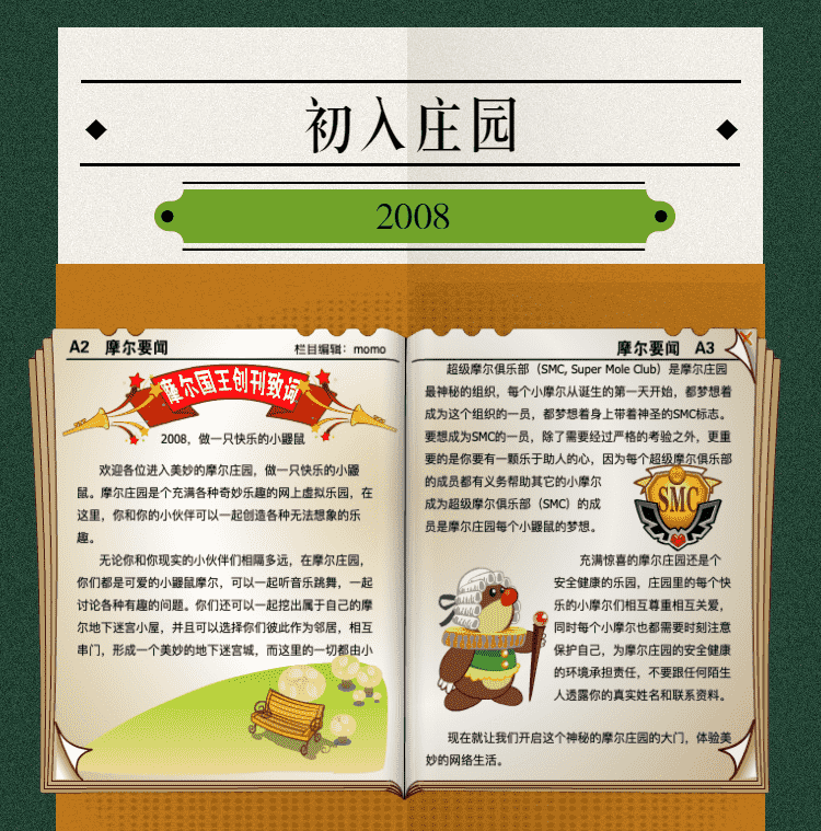 在这一年,,摩尔庄园诞生了。。。在这里,,,大家都是可爱的红鼻子鼹鼠小摩尔,,,可以一起勤劳耕作,,,一起高山滑雪......我们都是摩尔庄园的建设者。。