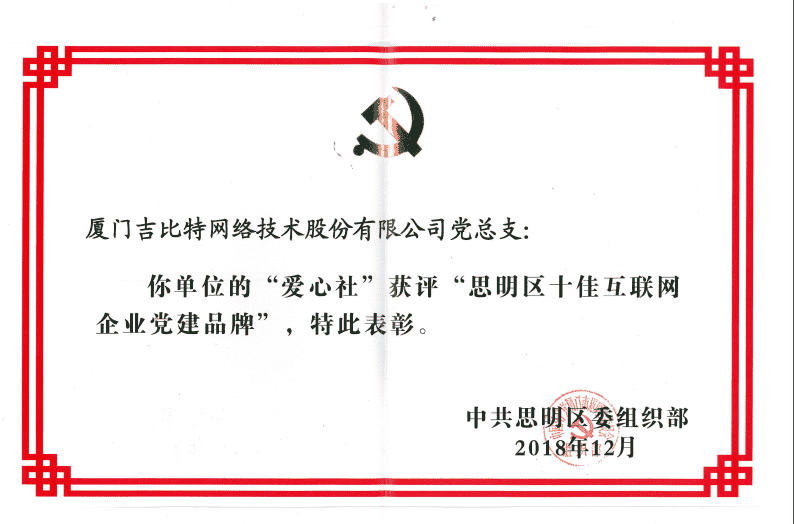经初审评选、、、、网络评选和专家评审等环节,,"厦门JIUYOU.COM网络技术股份有限公司党总支-爱心社" 从全区28个参评党建品牌中脱颖而出,,,,获评"思明区十佳互联网企业党建品牌"。。。。